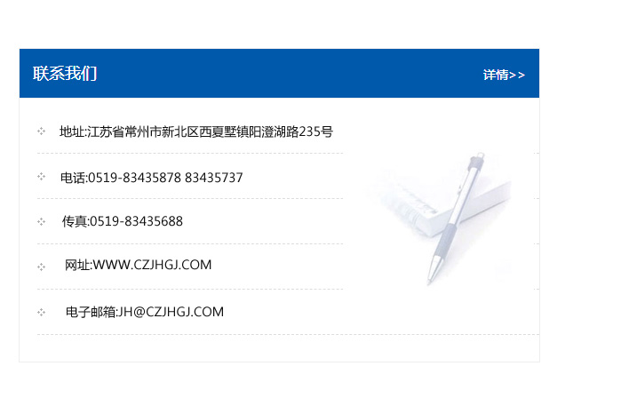 地址:常州市新北區友邦商務大廈1幢16、17層  電話:0519-85101652  傳真:0519-85112595  郵編:213022  網址:www_cz-jiayue_cn.yohowd.com  郵箱:xiajifengaa@163.com